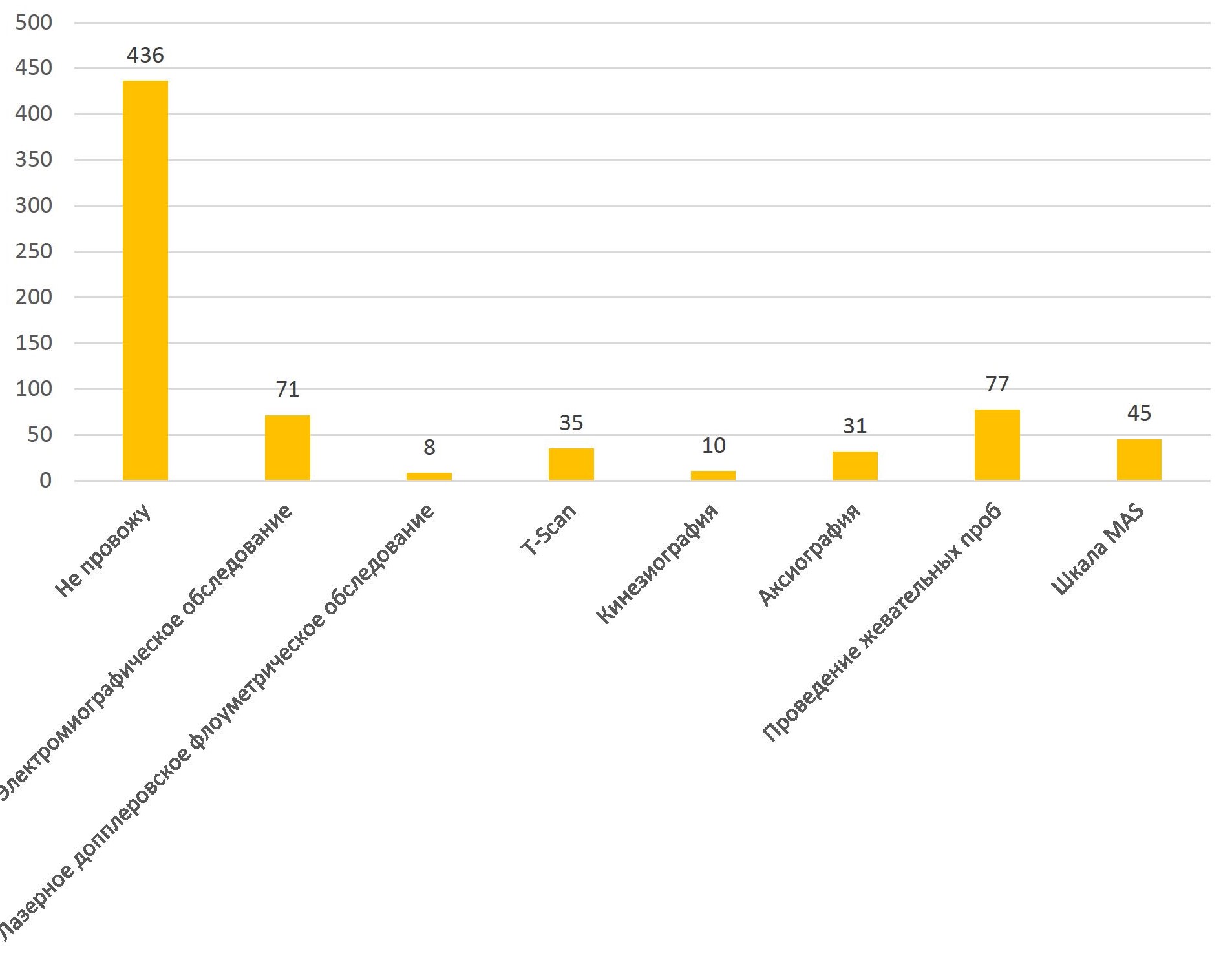 Результаты анкетирования представлены на рис. 2. Анализ данных по применению дополнительных методов исследования показал, что 73,9 % (436) опрошенных не проводят никакие дополнительные методы обследования, оценивают потенциал амплитуд жевательной и височной мышц с помощью поверхностной электромиографии 12 % (71) респондентов, оценку кровотока, выявление микроциркуляторных нарушений проводят 1,4 % (8 человек), кинезиографию и аксиографию – 1,7 % (10 человек) и 5,3 % (31 человек) соответственно, жевательные пробы и мышечный тонус по шкале MAS – 13,1 % (77 респондентов) и 7,6 % (45 респондентов) соответственно, T-Scan в своей практике используют 5,9 % (35 человек).