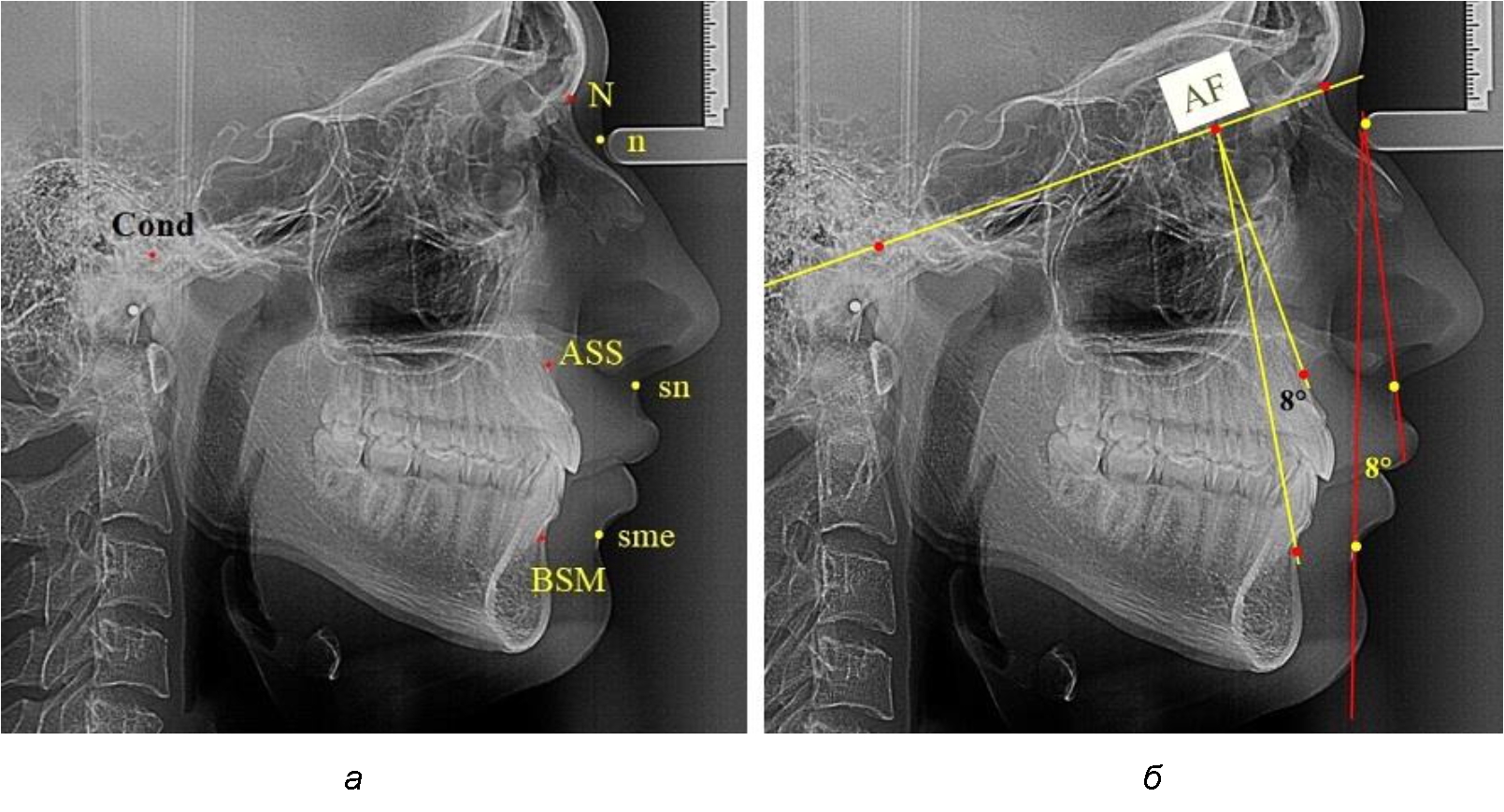 Для построения лицевого межгнатического угла по костным ориентирам использовали в качестве основного ориентира кондилярно-назальную линию, соединяющую точки Cond (верхняя точка суставной головки) и N (место соединения лобной и назальных котей). На передней поверхности челюстей, в наибольшей вогнутости переднего контура, отмечали апикальные точки Downs (ASS и BSM). Из субспинальной точки Downs верхнего апикального базиса ASS строили перпендикуляр к линии Cond–N. Место пересечения линий определяло положение конструктивной апикально-фациальной точки, которую обозначали литерами AF. Точку AF соединяли с супраментальной точкой Downs (BSM) нижнего апикального базиса. Таким образом, костный лицевой межгнатический угол обозначали как угол ASS–AF–BSM. Для определения типов нижней челюсти оценивали величину нижнечелюстного угла. В исследовании выделяли группы людей с нейтральным, вертикальным и горизонтальным типами, которые влияли на положение нижней челюсти.