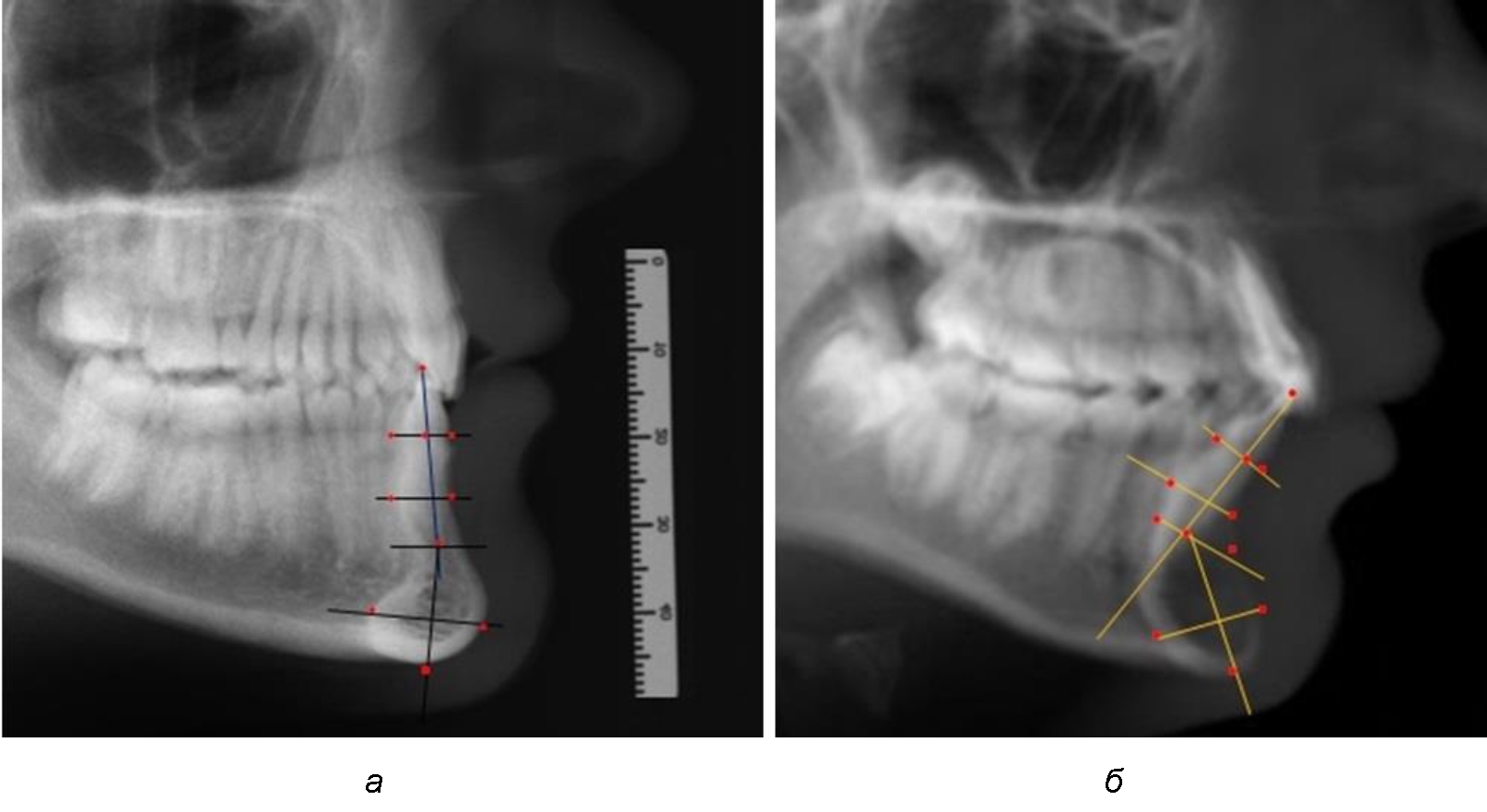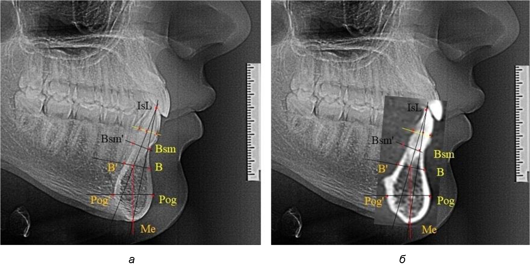 Рис. 2. Фрагменты ТРГ с ориентирами для измерения параметров резцового сегмента (а) и с наложением фрагмента КЛКТ (б)