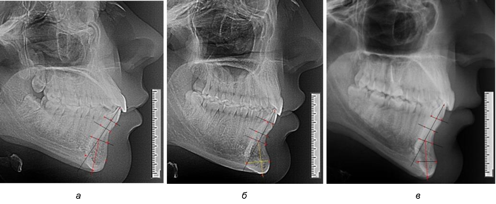 Рис. 4. Особенности нижнечелюстного резцового сегмента на ТРГ у людей при среднем (а), широком (б) и узком (в) вариантах