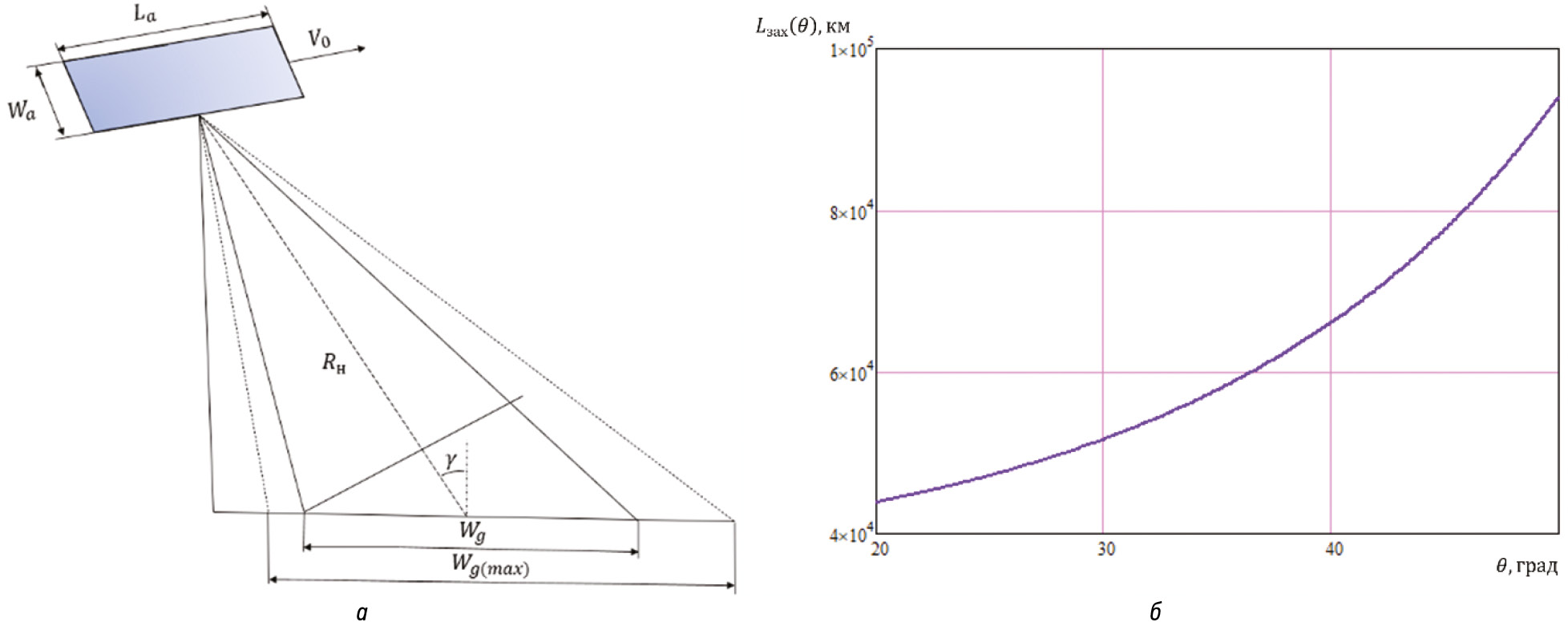 Методы. В качестве целевой аппаратуры МКА рассмотрен РСА с планарной антенной решеткой. Приведена упрощенная иллюстрация параметров геометрии КА с РСА апертурой бокового обзора (рис. 1, а), а также график зависимости полосы захвата при маршрутном режиме съемки от угла визирования (рис. 1, б).