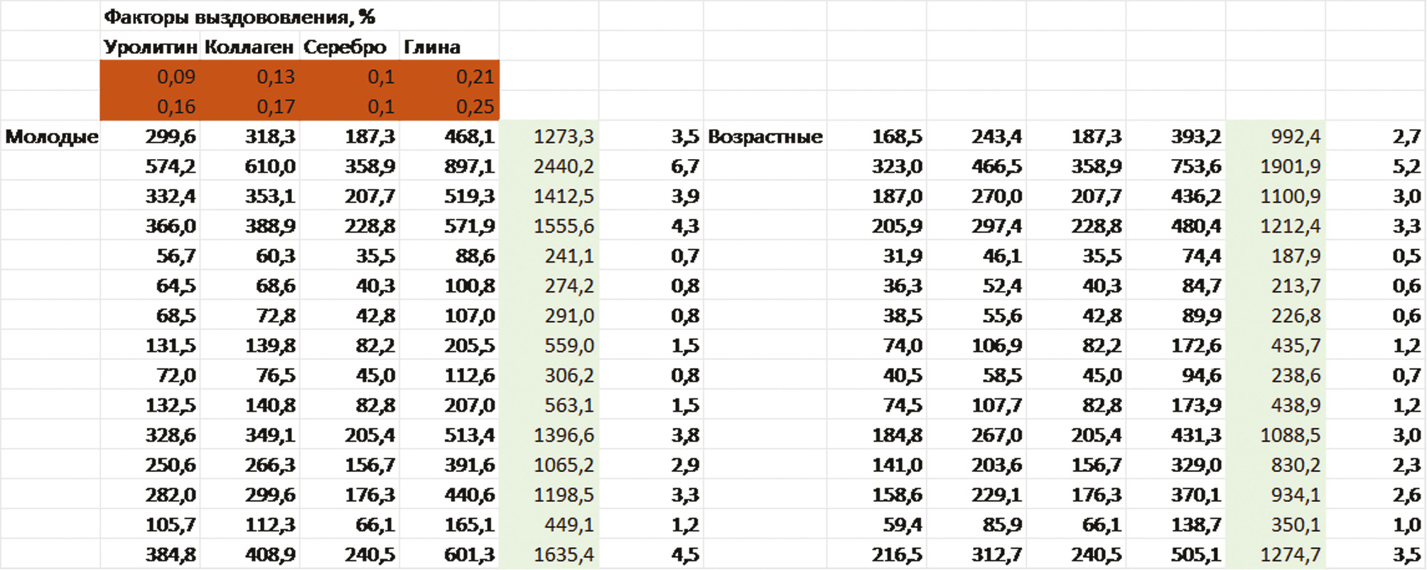 Методы. Главный метод решения проблемы — это введение в рацион питания трудящихся людей особых добавок. Поскольку многие производства связаны с риском получения профессиональных заболеваний [6, 8], то необходимо ввести корректирующую терапию, направленную на минимизацию последствий труда. В большей своей части трудящиеся России работают на предприятиях, работа на которых влечет за собой нарушения систем сердечно-сосудистой, опорно-двигательной, нервной, органов зрения, слуха, а также возникновение инфекционных, бактериальных, хронических заболеваний и всевозможных аллергий. Хотя государство и работает в некоторых направлениях, например ежегодной диспансеризации, однако этих мер недостаточно [4]. Для предупреждения и профилактики вышеперечисленного необходимо ввести в ежедневный рабочий рацион питания продукты, содержащие большое количество природного коллагена и уролитина А, веществ, способствующих обновлению мышечного и костного каркаса [3, 5]. Их длительное потребление способно продлить здоровье и выносливость мышц и костей, а также суставов и связок, сохранив их работоспособность. Что касается отравления загрязняющими веществами, их выведение нужно осуществлять через регулярные (раз в месяц) приемы воды с коллоидным серебром и бентонитовой глины [1, 2]. Эти продукты способны обеззараживать и всасывать в себя вредные вещества и организмы. В общей совокупности такая программа увеличит продолжительность трудоспособной жизни на 15–30 %.