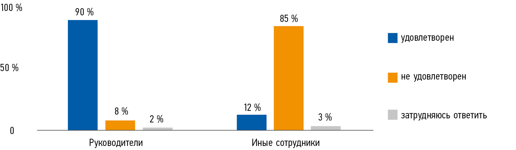 Ответы сотрудников ОАО «РЖД» на вопрос: «Удовлетворены ли Вы размером своего заработка?» показали разногласия. Большинство руководящих сотрудников (примерно 90 %) довольны своей зарплатой, но 8 % из них считают ее недостаточной. В то же время 85 % остальных сотрудников выразили неудовлетворенность уровнем заработной платы из-за различных причин, таких как неравенство оплаты по сравнению с отраслевыми стандартами и высокие ожидания. Это недовольство может повлиять на моральный дух и эффективность сотрудников, так как они могут быть менее мотивированы и вовлечены в работу.
