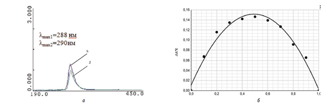Рис. 2. Результаты УФ-спектрометрического исследования: а — УФ-спектры свободного бисопролола (2) и в комплексе с 2-ГП-β-ЦД (1); б — диаграмма Джоба
