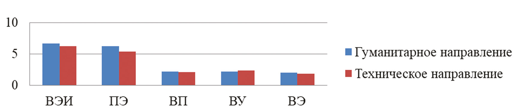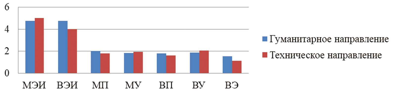Показатели МЭИ (межличностный ЭИ) на 5,5 %, МУ (управление чужими эмоциями) на 7,55 % и ВУ (управление своими эмоциями) на 9,91 % выше у женщин технического направления, чем у женщин гуманитарного направления подготовки (рис. 1). Это может быть обусловлено тем, что технические дисциплины могут включать элементы проектного управления и командной работы, где важно учитывать эмоциональные реакции участников для достижения целей. Также немаловажным является то, что специалисты в технических областях часто обучаются аналитическому мышлению, решению проблем и логическому анализу, что способствует более структурированному подходу к пониманию эмоций и взаимодействию с другими. Показатели ВЭИ (внутриличностный ЭИ) на 6,08 %, ПЭ (понимание эмоций) на 14,67 %, ВП (понимание своих эмоций) на 5,20 % и ВЭ (контроль экспрессии) на 8,83 % выше у мужчин гуманитарного направления (рис. 2), чем у мужчин технического направления подготовки. Это может быть обусловлено тем, что гуманитарные дисциплины акцентируют внимание на человеческом опыте, эмоциях и межличностных взаимодействиях, что способствует развитию навыков эмпатии и понимания эмоциональных состояний как своих, так и окружающих.