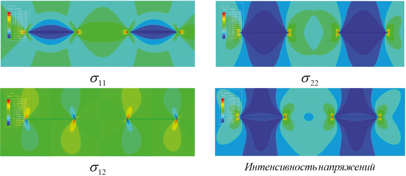 Рис. 2. Распределения напряжений и интенсивности напряжений для двух коллинеарных трещин