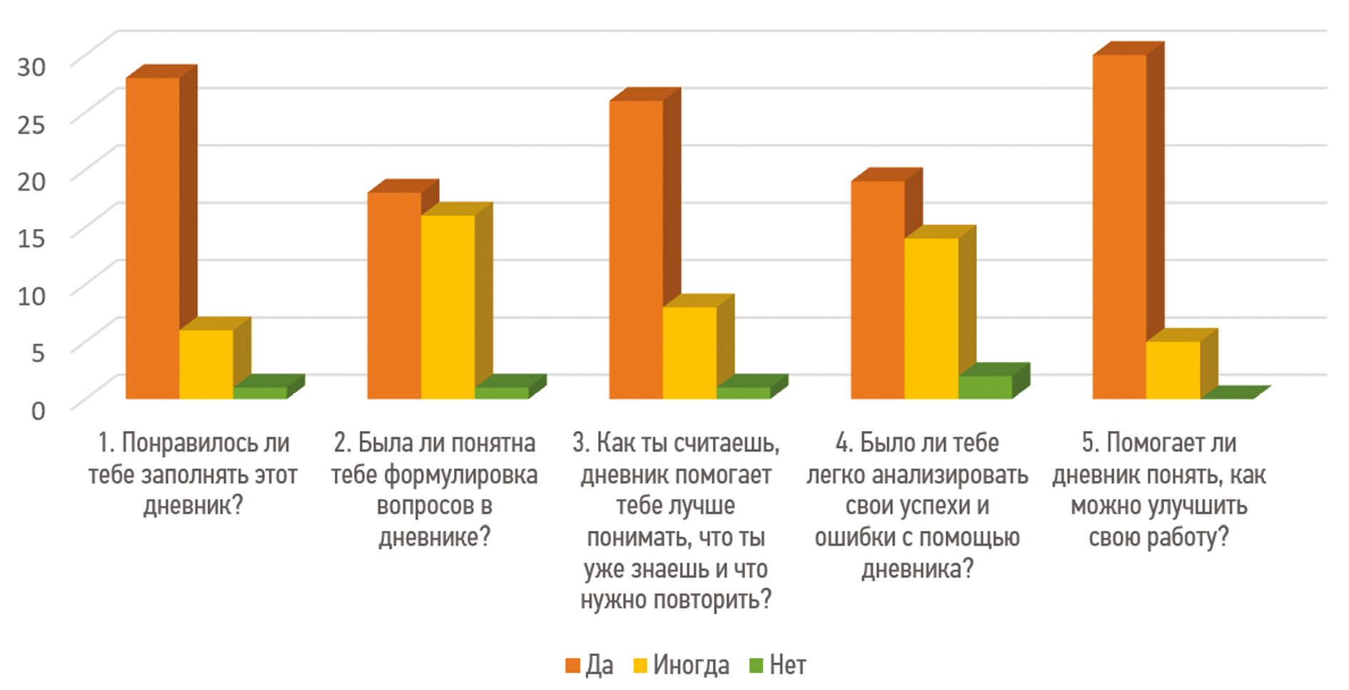Мы разработали листы дневника к некоторым модулям и апробировали данную разработку в 4-х классах МБОУ «Школа № 27» г.о. Самара. В конце уроков обучающиеся заполняли дневник, а по окончании эксперимента ответили на вопросы анкеты. Результаты анкетирования (рис. 1) показали рост осознанности обучающихся, их интерес к обучению, а также повышение самооценки. Наблюдения педагогов подтвердили положительное влияние дневника на учебную мотивацию и элементы автономии младших школьников.