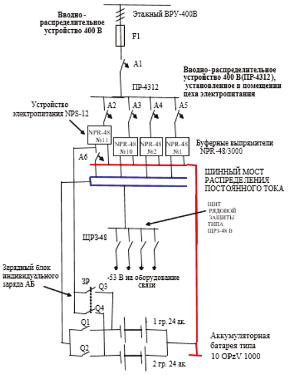 Результаты. Как видно из рис. 1, 11 выпрямительных модулей работают параллельно на общую нагрузку, а 1 является резервным. Двухгруппная аккумуляторная батарея подключена параллельно к шинам постоянного тока. Модульная конструкция позволяет изменять размеры системы в зависимости от необходимой мощности. Также в электропитающих установках предусмотрена защита от перегрузок и коротких замыканий в виде предохранителей, автоматических переключателей или реле.