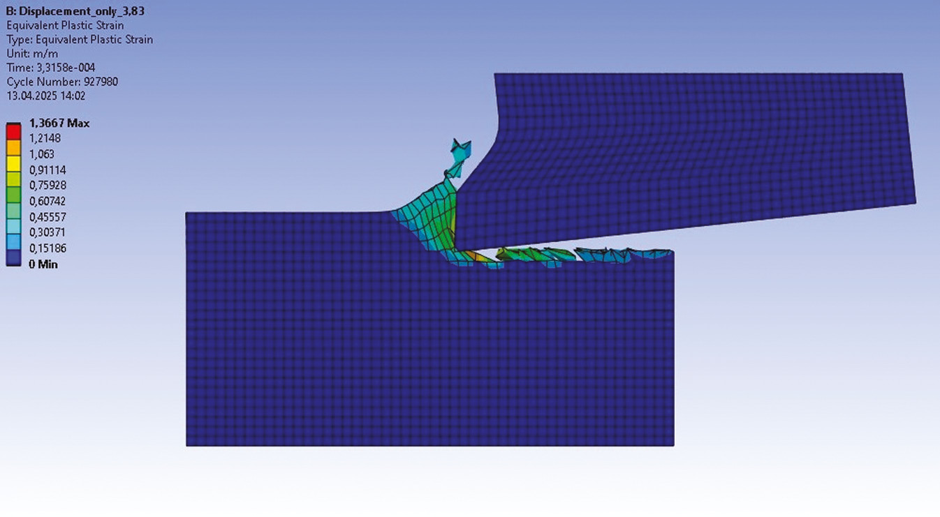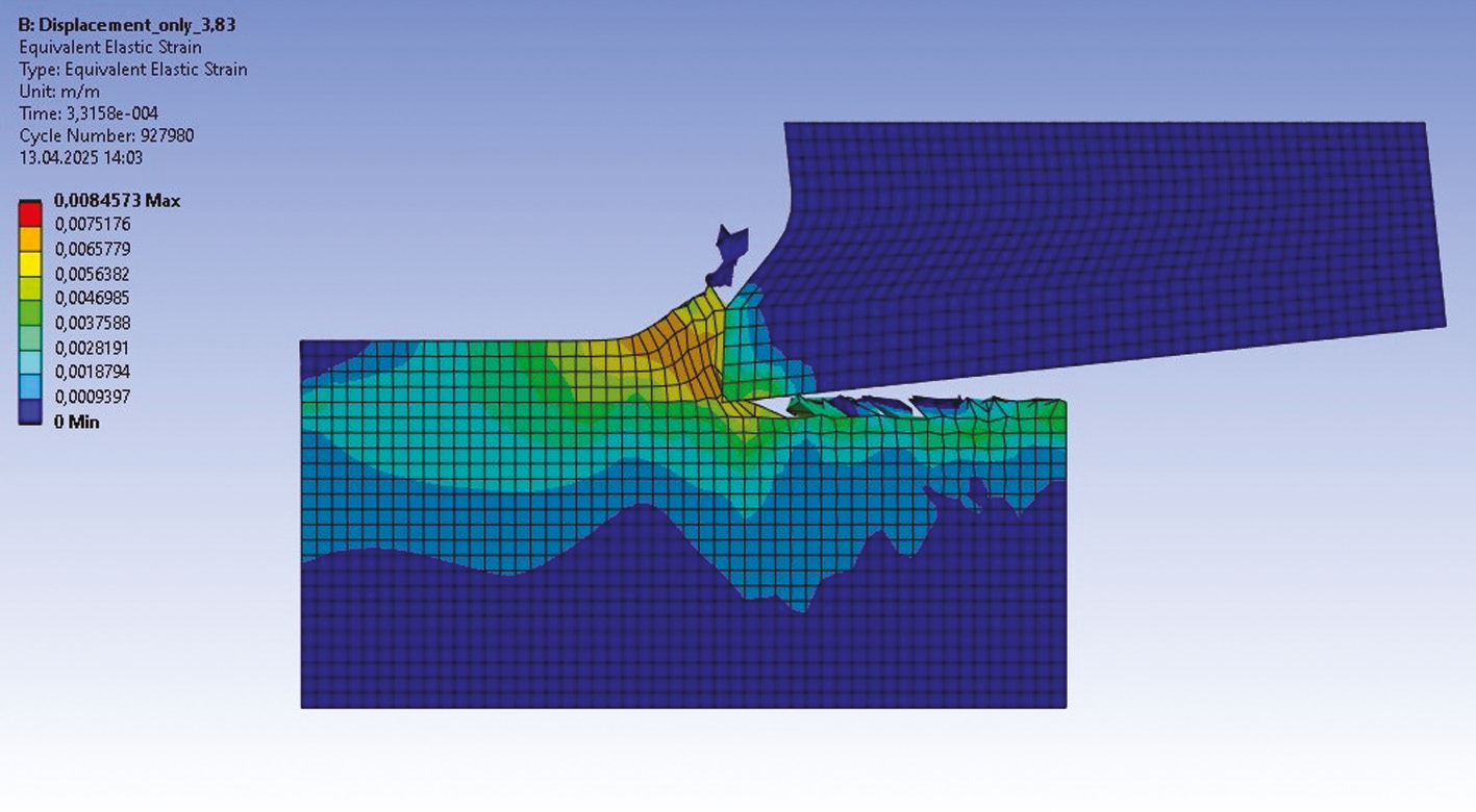Результаты. Построена принципиально работоспособная CAE-модель процесса резания металла. С ней могут быть получены картины распределения упругих и пластических деформаций, напряжений (рис. 1–3) как в инструменте, так и в заготовке. Модель может быть скорректирована путем изменения констант, перестроением геометрии и изменения параметров обработки.