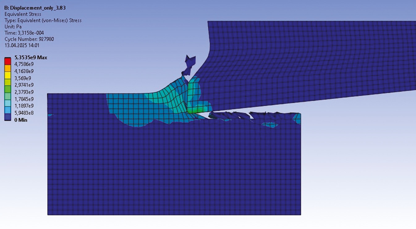 Методы. Процесс механической обработки металла может быть рассмотрен как случай нелинейной задачи явной динамики. Процесс резания металла, точение, протекает во времени с высокой скоростью, вызывает разрушения обрабатываемого материала, а также накопление напряжений, в том числе усталостных, приводящих к износу и разрушению инструмента. Симуляция процесса обработки производится в программном пакете ANSYS в модуле Explicit Dynamic. Особенностью решаемой задачи является стабильность процесса воздействия на тело разрушающей нагрузки в течение длительного времени, что нехарактерно для моделирования задач явной динамики, таких как задачи баллистики, возникновения ударов, столкновений, к которым применим используемый решатель.