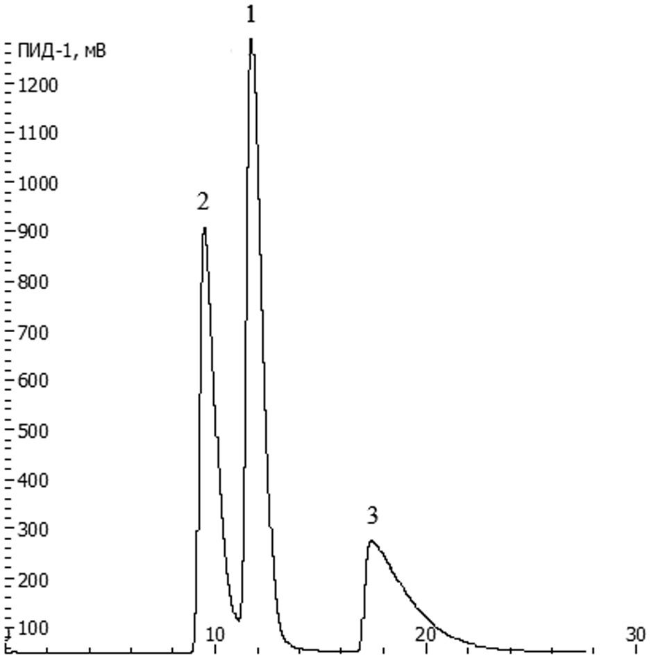 Рис. 1. Хроматограмма разделения н-октана и его изомеров при Т = 140 ℃, ΔР = 40 кПа: 1 — н-октан, 2 — 2,2,4-триметилпентан, 3 — 2,2,3,3-тетраметилбутан