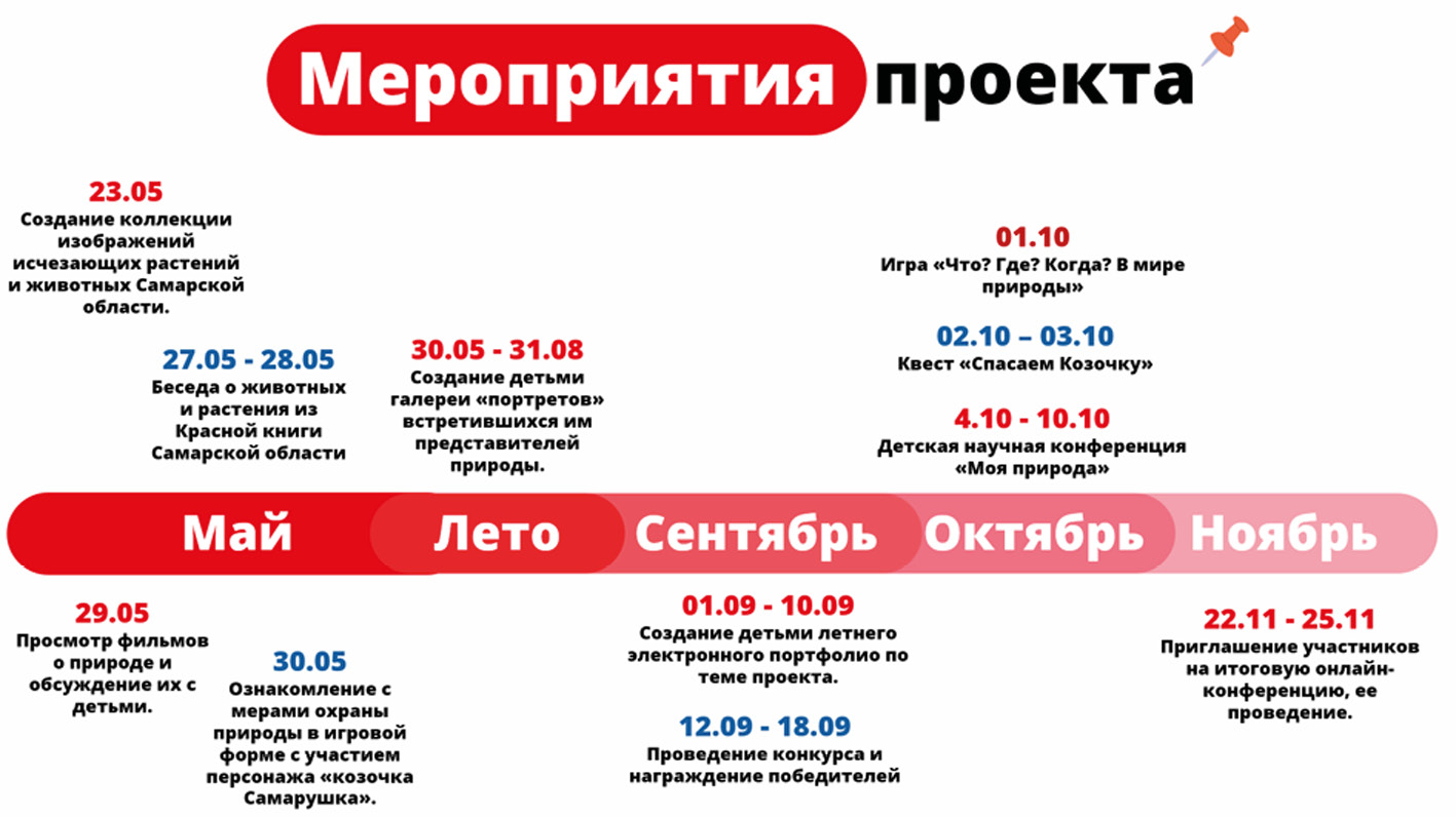 Учитывая данные анкетирования и анализа собранной теоретической информации, мы разработали список мероприятий в рамках проекта: беседа о животных и растениях из Красной книги Самарской области, создание детьми галереи «портретов» встретившихся им представителей природы и другие мероприятия (см. рис. 2).