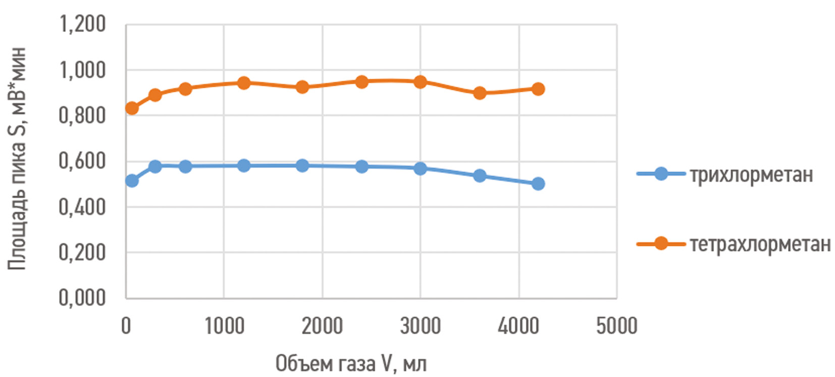 В качестве носителя для сорбента был использован диатомитовый кирпич. Жидкой неподвижной фазой являлось неполярное соединение сквалан (пропитка: 30 %). Зависимость сигнала детектора (площади хроматографического пика) от объема пропускаемого через систему газа представлена на рис. 2.