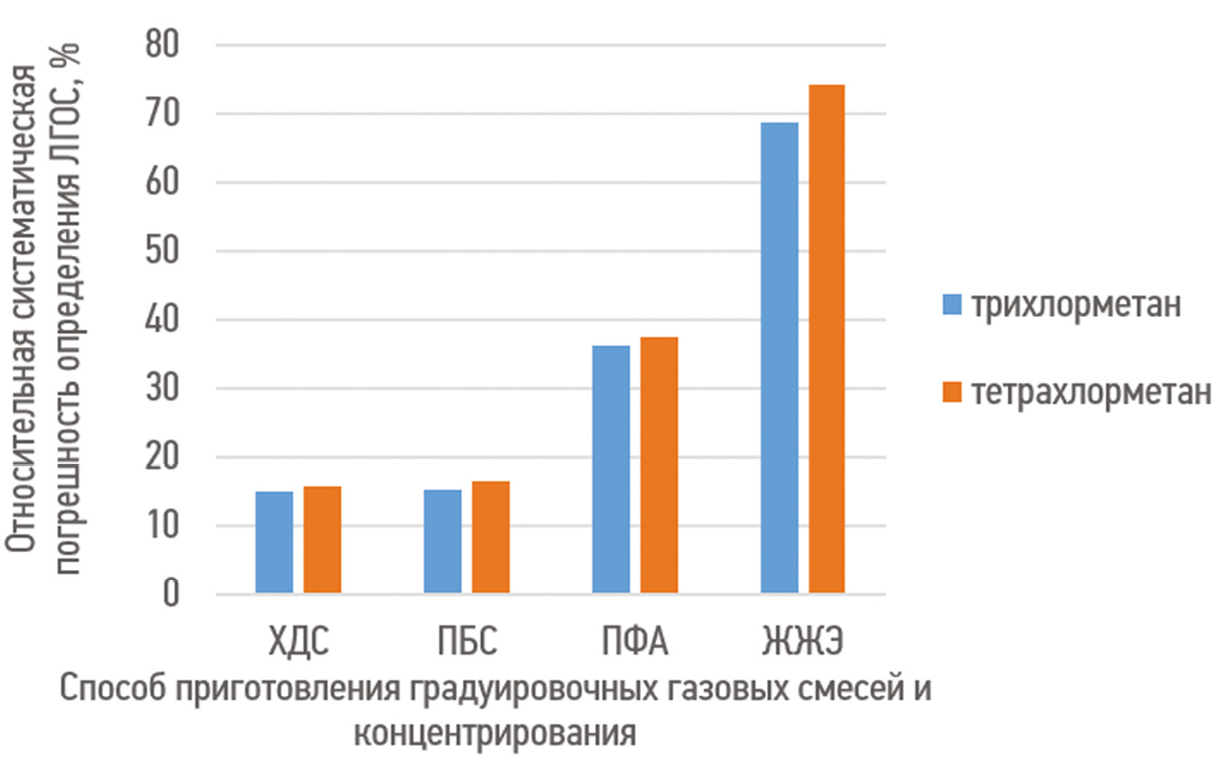 Можно заметить, что для обоих аналитов (трихлорметан, тетрахлорметан) наблюдается период квазипостоянства концентраций. Таким образом, варьируя температуру десорбции, возможно получение газовых смесей заданного состава. Оценка точности количественного определения ЛГОС с использованием стандартных способов и ХДС представлена на рис. 3.