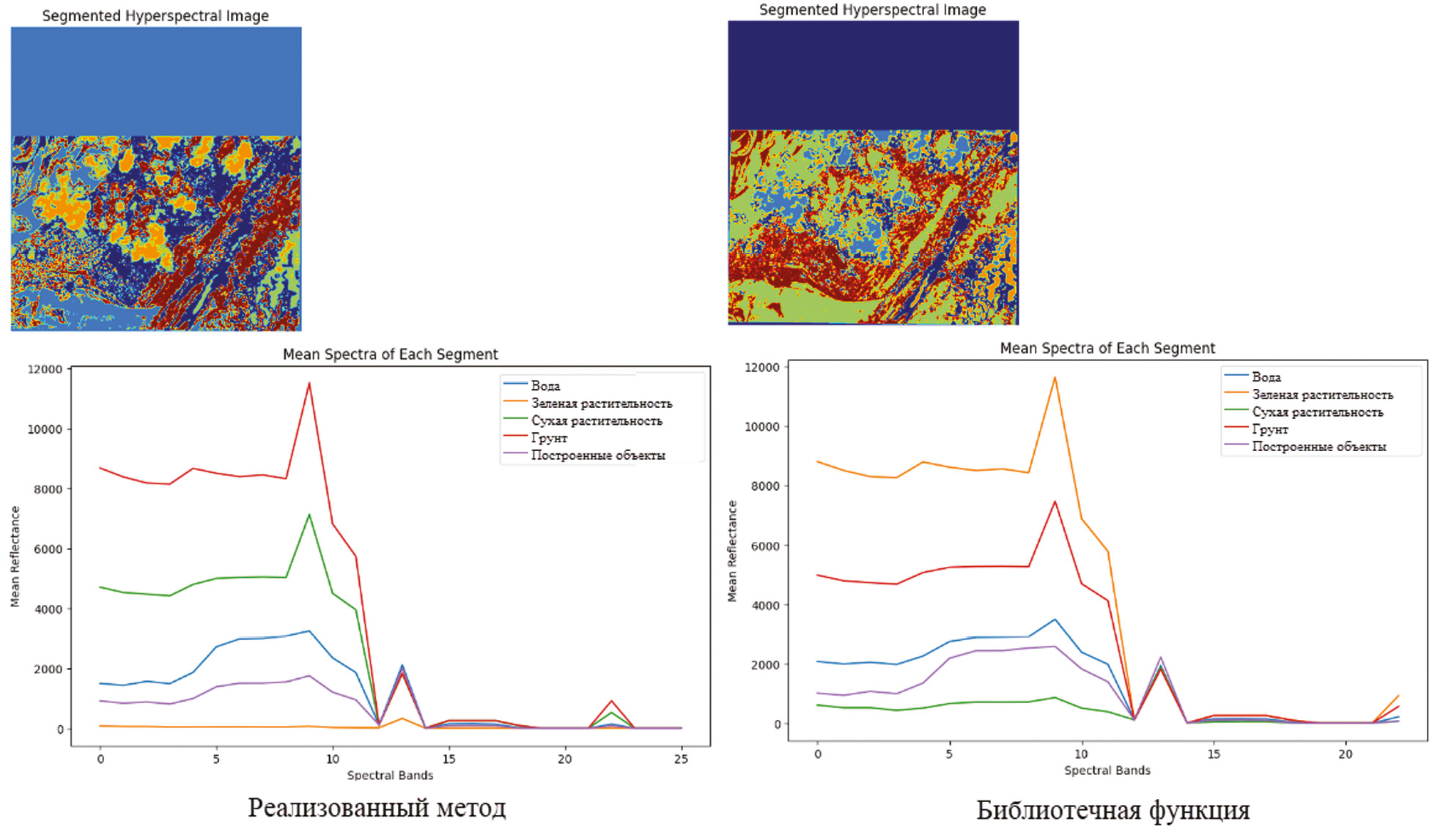 Перейдем к описанию ручного алгоритма. Для начала происходит считывание гиперспектральных изображений. Следующим шагом преобразовываем гиперспектральное изображение в двумерный массив, где каждая строка содержит спектральные значения одного пикселя. Для уменьшения размерности используется метод главных компонент, который сокращает заданное число спектральных каналов до заданного. При работе алгоритма K-средних для ускорения вычислений берется случайная подвыборка данных. Центроиды инициализируются методом K-средних++ для равномерного распределения [2]. Для каждой точки в данных вычисляется минимальное расстояние до любого из уже выбранных центроидов. Это минимальное расстояние показывает, насколько каждая точка «удалена» от ближайшего кластера. Вероятности для каждой точки вычисляются как нормализация этих расстояний: более удаленные точки имеют больший шанс быть выбраны. Следующий центроид выбирается с учетом этих вероятностей. Вычисляются расстояния от каждой точки до всех центроидов [3]. Точка назначается ближайшему центроиду. Для каждого кластера вычисляется среднее значение точек, принадлежащих этому кластеру. Если кластер пуст, выбирается случайная точка как новый центроид. Если все центроиды почти не изменились, алгоритм завершает работу. Последние шаги выполняются в цикле, пока не достигнуто максимальное число или пока сходимость не произойдет. Отдельная функция анализирует каждый кластер [4]. Для этого извлекаются все пиксели, принадлежащие конкретному кластеру, и вычисляется средний спектр для этих пикселей. Средние спектры позволяют интерпретировать, какие объекты представлены в каждом сегменте. В результате работы алгоритмов были получены следующие данные, изображенные на рис. 1.
