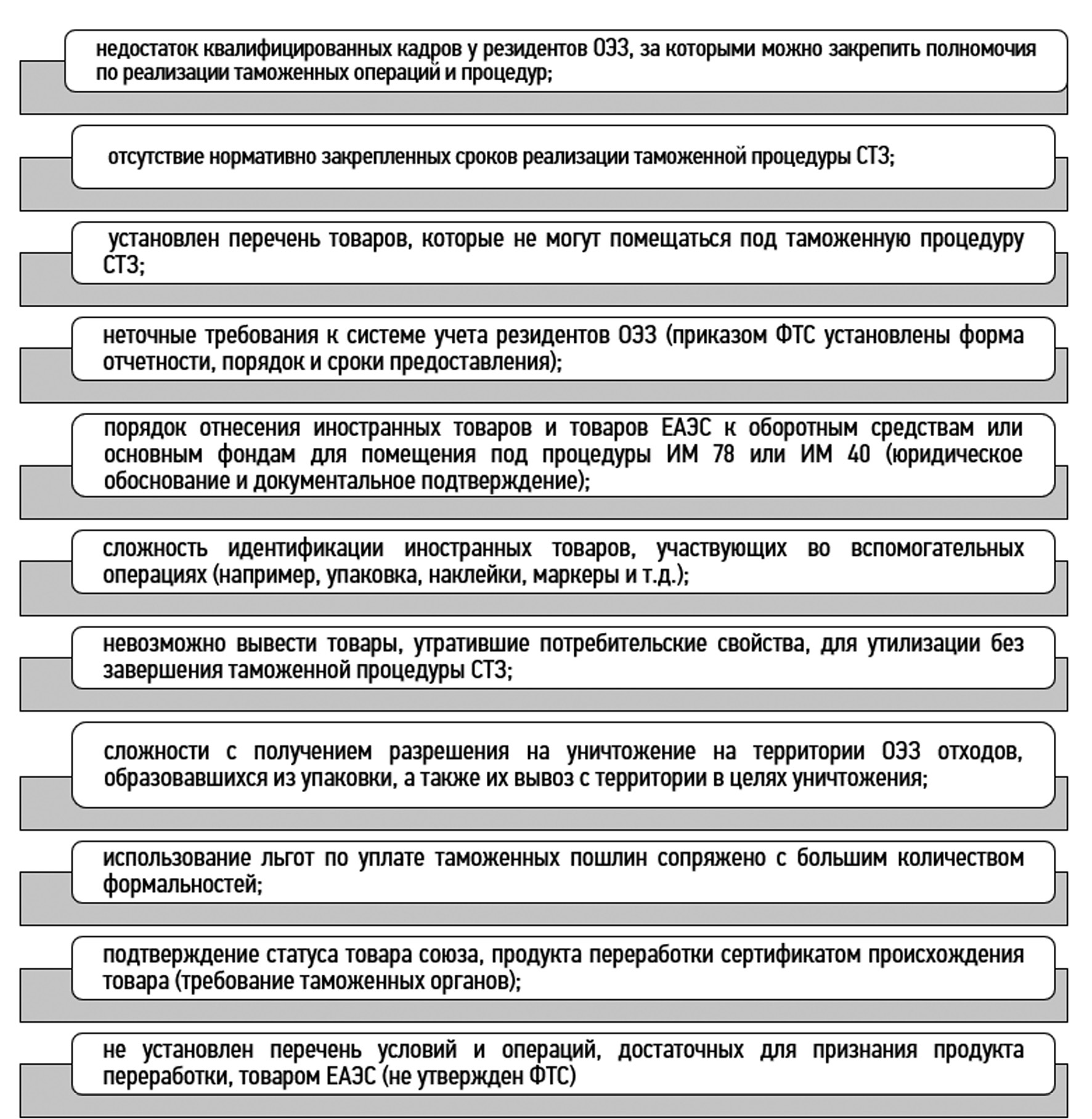 С правовой точки зрения ОЭЗ — это «часть территории страны, в пределах которой установлен особый (специальный правовой) режим осуществления предпринимательской деятельности, в частности применяться таможенная процедура свободной таможенной зоны» [3]. Применение данной процедуры, с одной стороны, позволяет резидентам ввозить и использовать на территории ОЭЗ иностранные товары и товары Союза (оборудование, сырье, комплектующие, строительные материалы) «без уплаты ввозимых и вывозных таможенных пошлин, налогов и без применения мер нетарифного регулирования в отношении товаров» [1, 2]. Но с другой — ограничивает применение товаров территорией ОЭЗ и накладывает на резидентов обязанность по реализации в отношении этих товаров и произведенных продуктов закрепленных законодательством таможенных операций. Для выявления узких мест таможенного регулирования был проведен опрос резидентов ОЭЗ «Тольятти» и должностных лиц Тольяттинского таможенного поста, что позволило сформулировать основные сложности, с которыми они сталкиваются при реализации таможенных операций (рис. 2).